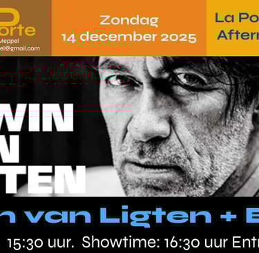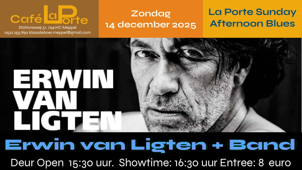De winter mag dan in aantocht zijn, maar bij CafĂ© La Porte stijgt de temperatuur op zaterdag 14 december flink. Niemand minder dan Erwin van Ligten â gitarist, zanger, componist en muzikale verhalenverteller pur sang â brengt samen met zijn band een avond vol groove, soul en gitaarmagie.