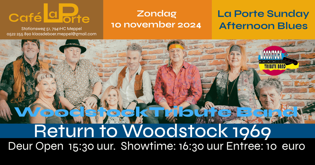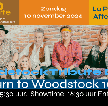 Op 10 november 2024 komt Woodstock tot leven in Café La Porte. De Woodstock Tribute Band, bestaande uit 8 getalenteerde muzikanten, zal het legendarische Woodstock repertoire live ten gehore brengen. En dat doen ze op zo'n indrukwekkende wijze dat het bijna niet te onderscheiden is van het origineel. Dit is echt iets bijzonders!