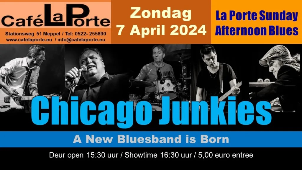 7 april 2024 in Café La Porte Meppel CHICAGO JUNKIES Deur Open 15:30 Showtime: 16:30 Entree: 5 euro