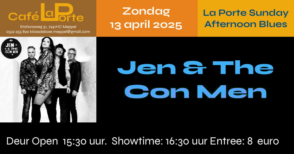 Maak je klaar voor een knallend optreden, want Jen & The Con Men staan op het punt om het La Porte podium in vuur en vlam te zetten! Deze band uit Brabant en Zeeland is een frisse toevoeging aan de blues scene en belooft een onvergetelijke avond vol blues, soul en rock 'n roll.